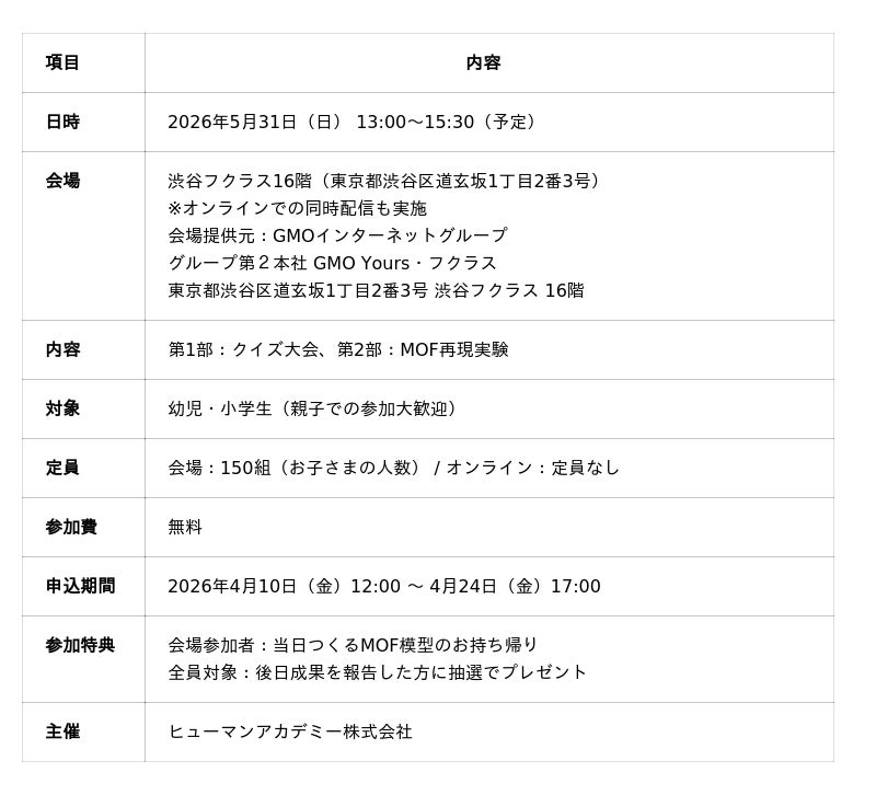 教育事業を展開するヒューマンアカデミー株式会社(本社:東京都新宿区、代表取締役:田中知信、以下「当社」)の児童教育事業「ヒューマンアカデミージュニア」は 、2026年5月31日(日)にサイエンスフェス ノーベル化学賞特別編として「体験!ノーベル化学賞の世界」を開催いたします。本イベントは、同社が運営する科学教室「サイエンスゲーツ」によるスペシャルプログラムで、受賞研究を支えた専門家が登壇します。子どもたちが世界で注目されている最先端科学「MOF(金属イオンと有機分子から成る、ジャングルジムのような空洞をもった多孔性物質)」をテーマに、クイズや実験を通じて科学の楽しさと驚きを体験できるプログラムを提供します。会場(渋谷)とオンラインのハイブリッド形式で、全国の親子が無料で参加可能です。