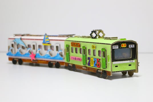 ダンボールで組み立てられた電車の土台にドアや窓、パンタグラフなどほかにも様々なパーツを自由に貼り付けてオリジナル電車を作ります。夜には、中にセットしてあるLEDライトを点灯してランタンのように光らせて楽しむこともできます。※車輪は回らないタイプです。