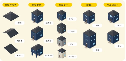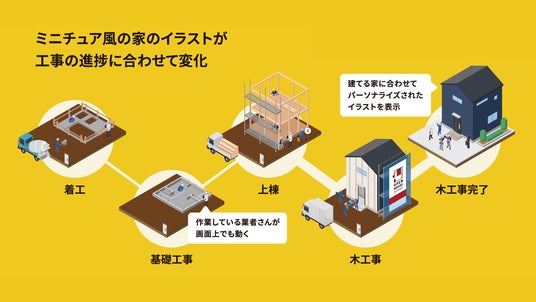 屋根やお家の形状、カラー、階数、バルコニーのあり・なしなど、お客様の住宅の特徴に沿ったイラストで建築過程をシミュレーションします。また、着工前からお引渡しまで、全9工程の進捗に合わせてミニチュア風のイラストや背景が変化するほか、現場で働く大工や業者のイラストがかわいらしく動き、家を造る方々へ親近感を醸成します 。