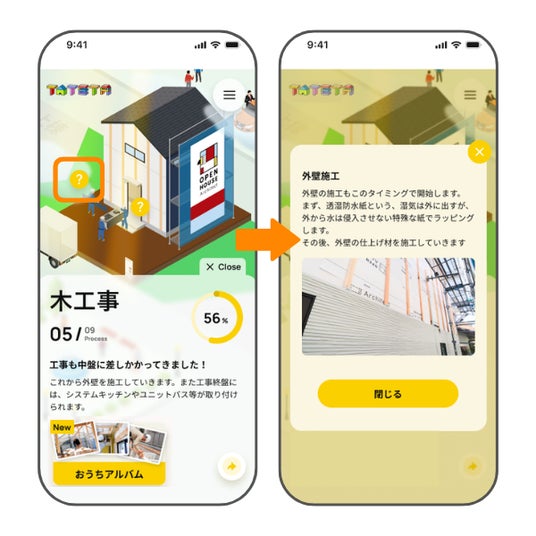 アニメーション内の「?」マークをタップすると、専門的な工事内容を写真付きで分かりやすく解説します。建築知識がない方でも「今、何をしているのか」を正しく理解でき、不安を納得と安心に変えることができます。