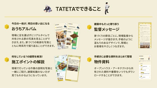 株式会社オープンハウスグループ(本社 東京都千代田区、代表取締役社長 福岡 良介、以下「当社」)のグループ会社である株式会社オープンハウス・アーキテクト(本社 東京都中野区、代表取締役 長井 光夫、以下「オープンハウス・アーキテクト」)は、注文住宅の建築工程をアニメーションで可視化し、施主様へ届ける革新的な新サービス「TATETA(タテタ)」をリリースいたしました 。