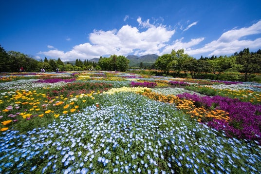 標高850mの久住高原の春は他の地域より遅いのが特徴ですが、冬の寒さを耐えた花たちは輝きを放ち、高原のキャンバスを埋め尽くします。遅めの春は、可憐なチューリップから始まり、視界に入りきらないほどのネモフィラの花畑、パッチワークのような植え込みが人気の「春彩の畑」、そして色鮮やかなリビングストンデイジーの目前に立つと、まるで異世界に立っているかのような気さえしてくるでしょう。