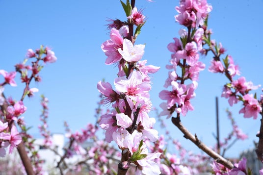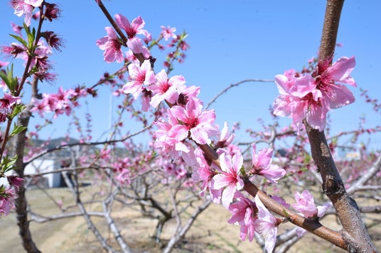 4月を迎えて鮮やかな桃の花が畑一面を鮮やかなピンク色に染め、春の訪れを告げています。