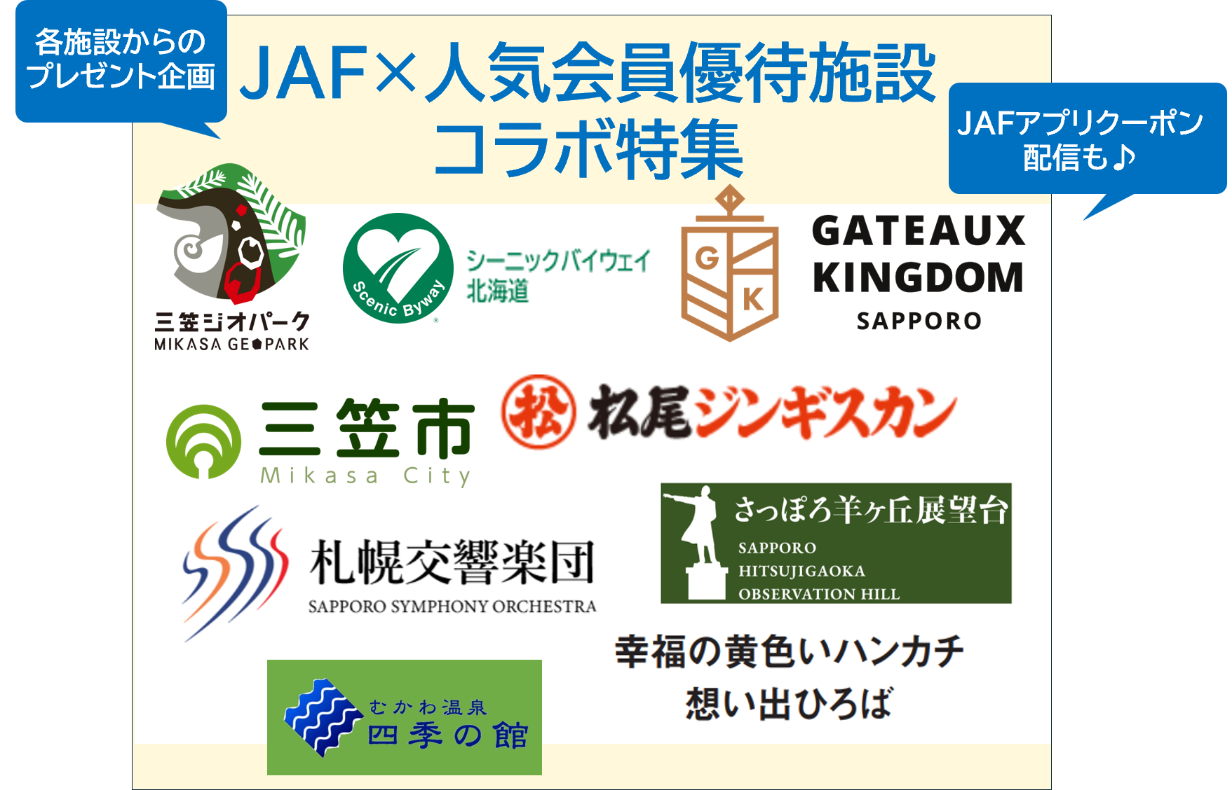 一般社団法人日本自動車連盟(JAF)札幌支部(支部長:横井 隆)は、4月10日(金)から6月30日(火)まで、道内の優待施設や自治体など計8団体と連携した初の共同企画を実施します。