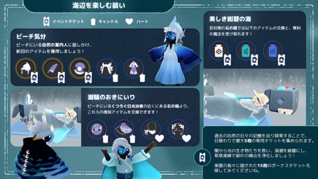 イベント専用通貨「イベントチケット」は、各種アクティビティへの参加で1日最大5枚まで獲得できるほか、楽園の島々のエリア内には一度限り入手可能な15枚のボーナスチケットが隠されています。集めたチケットは、イベント限定のコスメティックアイテムと交換できます。