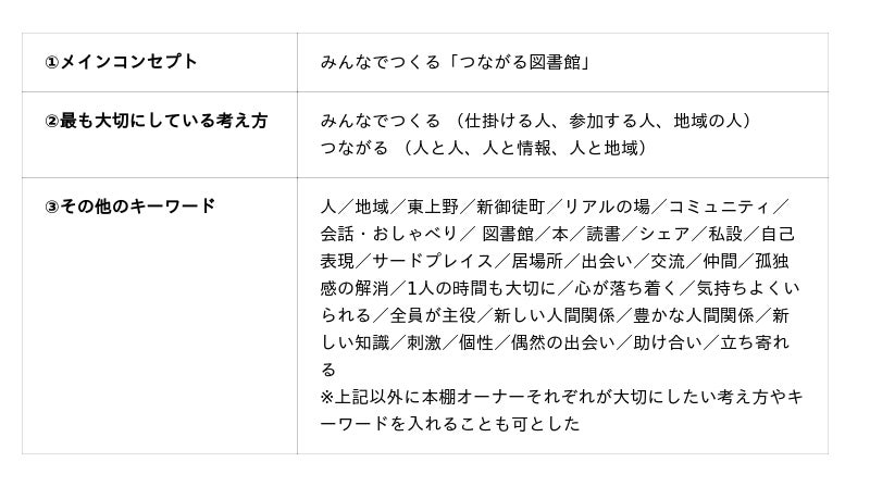 みんなで考えるといっても、1人1人が何の制約もなく考えていては、全くまとまりも統一感もない名前ばかりになってしまう可能性があります。そこで、この図書館が大切にしている考え方とコンセプトを明確にして、それに沿う形で名前を考えることにしました。名称検討にあたって踏まえた「大切にしている考え方とコンセプト」