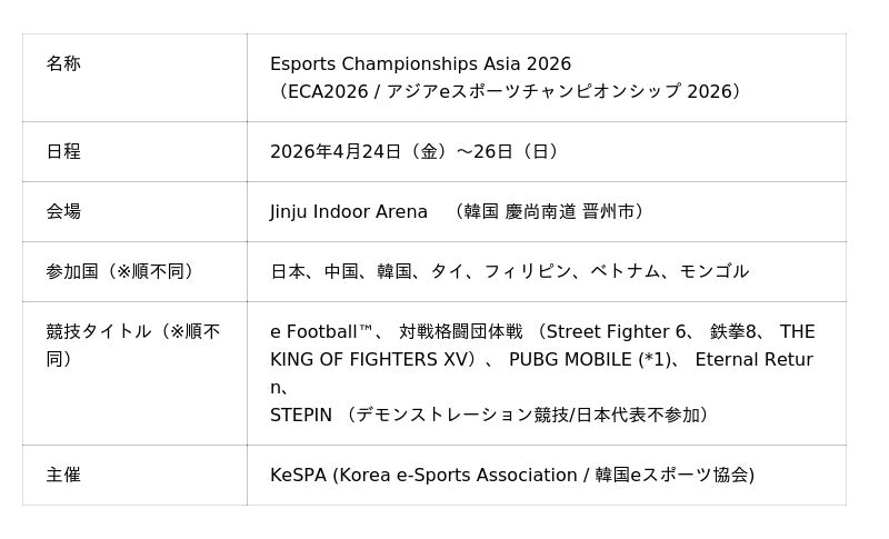 一般社団法人日本 e スポーツ協会(会長:早川英樹 以下、JESU)は、4月24日(金)から韓国で開催される「アジアeスポーツチャンピオンシップ 2026」(Esports Championships Asia 2026、以下ECA 2026)に、日本代表選手団を派遣することをお知らせします。