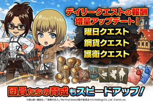 本日、2026年4月10日(金)にデイリークエストの報酬を増量アップデート。団員たちの育成もスピードアップ!