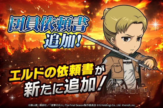 株式会社enish(本社:東京都港区、代表取締役社長:安徳 孝平、以下enish)は、アニメ『進撃の巨人』のスマートフォンゲーム最新作「進撃の巨人Brave Order」にて、2026年4月10日(金)より、新イベントの精鋭の名に懸けてを開催!また、本日より【調査兵団コート】リヴァイ、【新型立体機動】ペトラ・ラル、【新型立体機動】オルオ・ボザドが登場する「精鋭の名に懸けてガチャ」も開催!その他、最新情報はゲーム公式サイト・ゲーム公式X(旧Twitter)アカウントにて随時公開して行きますので、ぜひご覧ください。