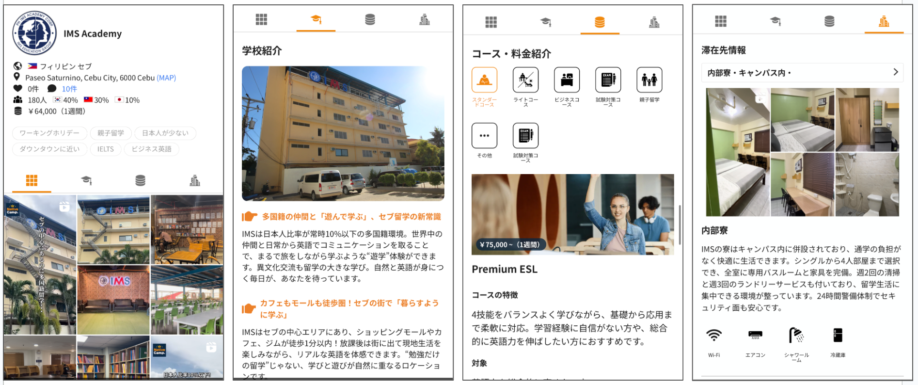 ネイティブキャンプ留学では、ユーザーが必要な情報を分かりやすく把握できるよう、常に丁寧で明確な情報提供を心がけています。IMSの詳細情報は、以下の4つのカテゴリーに分けて掲載しており、知りたい情報を的確にお届けします。