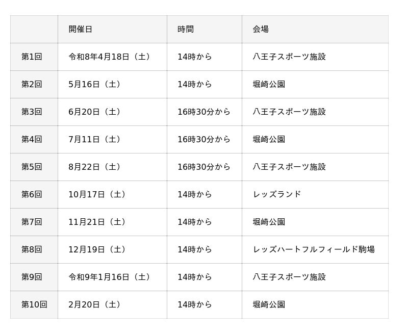 練習会(月1回程度)のほか、交流試合、セミナー等の実施を予定しています。練習会のスケジュールは、以下のとおりです。