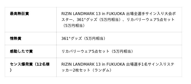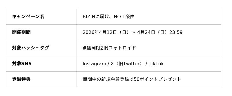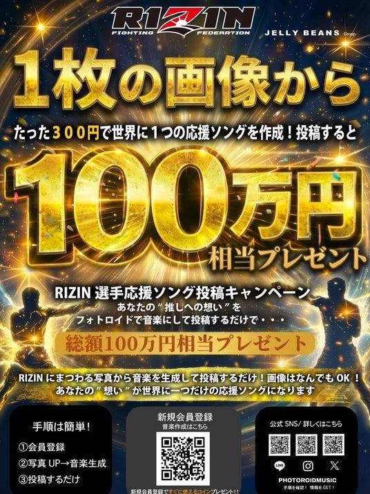 正式リリースを記念し、同日開催の「RIZIN LANDMARK 13 in FUKUOKA」と連動した総額100万円相当のプレゼントキャンペーンを実施いたします。RIZINにまつわる画像からフォトロイドミュージックで楽曲を作成し、SNSに投稿するだけで豪華賞品が当たるチャンスです。
