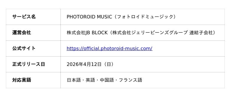 株式会社ジェリービーンズグループ(本社:東京都台東区、代表取締役:宮崎 明、以下「当社」)の連結子会社である株式会社JB BLOCK(代表取締役社長:宮崎 明)は、AI音楽制作サービス「フォトロイドミュージック」を2026年4月12日(日)に正式リリースいたしますことをお知らせいたします。