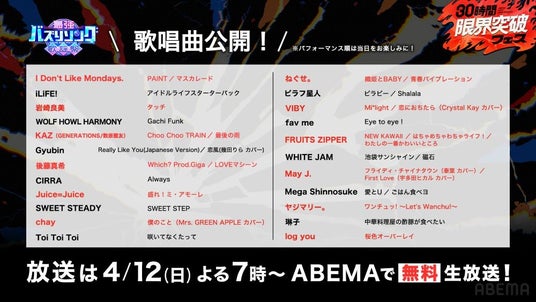 新しい未来のテレビ「ABEMA(アベマ)」は、2026年4月11日(土)に開局10周年を迎えます。「ABEMA」10周年を記念し、4月11日(土)午後3時から12日(日)夜10時にわたり、特別番組『30時間限界突破フェス』を生放送。このたび、『30時間限界突破フェス』のグランドフィナーレ企画『最強バズりソング歌謡祭』において、全出演アーティストの歌唱曲を発表いたしました。