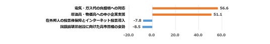 参院予算委員会は4月6、7両日、高市早苗首相が出席して26年度予算案について集中審議を行った。この審議で質問者が取り上げた主な項目のうち、質疑するのにふさわしいと思う項目と、ふさわしくないと思う項目を、それぞれ複数回答で選んでもらった。「ふさわしい」「ふさわしくない」の差(ネットスコア)をとると、上位は「電気・ガス代の負担増への対応」+56.6ポイント、「原油高・物価高への中小企業支援」+51.1ポイントだった。反対に、下位は「国旗損壊罪創設に向けた高市首相の姿勢」-8.5ポイント、「在外法人の投票権保障とインターネット投票導入」-7.8ポイントとなった。