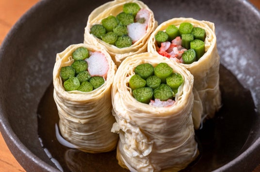 ゆばや薄焼き卵で巻くと素敵な一品に