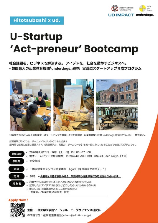 本連携の第一弾として、起業前段階の学生を対象とした実践型プログラム「Hitotsubashi x ud. U-Startup “Act-preneur” Bootcamp 2026」を2026年4月25日(土)・26日(日)10:00~17:00に開催予定です。本プログラムは、現在参加者を募集しています。