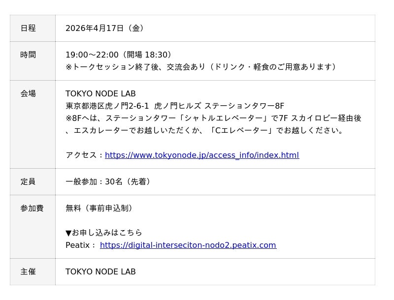 株式会社360Channel(本社:東京都港区、代表取締役社長:小松恵司、以下360Channel)は、テクノロジーとクリエイターが交差する共創コミュニティ「Digital Intersection(デジタル・インターセクション)」の第2弾イベントとして、森ビルが運営するTOKYO NODE LABと共催にて、「Digital Intersection Node.2:攻殻機動隊展の最新事例から見るARの世界」を2026年4月17日(金)に開催いたします。