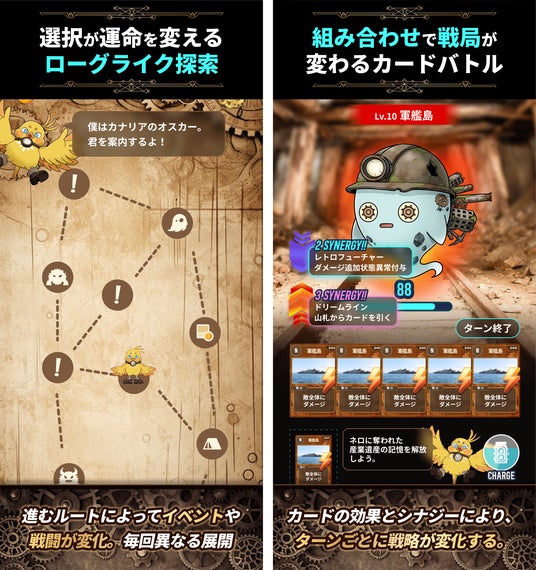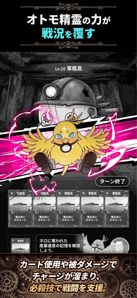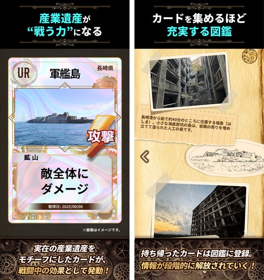 ステージクリアで入手できるカードは、実在の産業遺産(軍艦島など)をモチーフにしています。カードを集めることで、図鑑からその場所の背景エピソードや歴史などの「記録」を段階的に読み解くことができます。