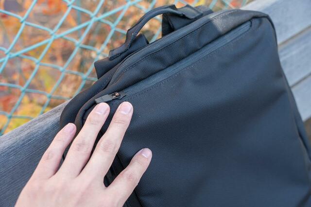 サイズは幅30×高さ44×厚み8cmで、16インチPCも収まるサイズ。質感も落ち着いているので、ビジネス用のバッグとしても違和感はありません。