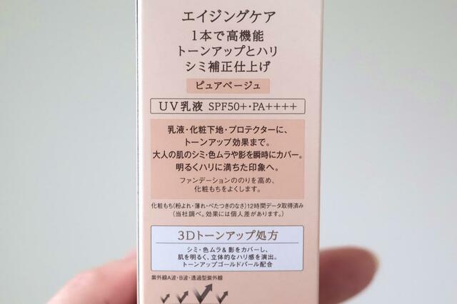 そして、「ピュアベージュ」のカラーには、「シミ・色ムラを補正し、肌を明るく見せる」という「トーンアップゴールドパール」が配合されています。