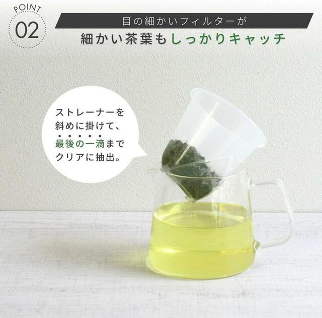 樹脂製で型崩れしにくく茶葉も挟まりにくいため、茶殻の処理も簡単。さらにストレーナーに「足」がついているため、ポットから外しても自立しますよ。