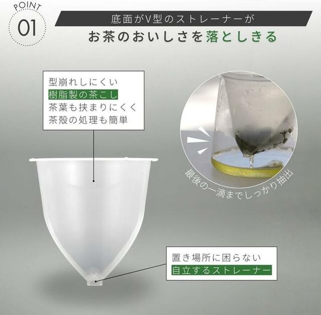 ひとつめは商品名の「V」にあり。ストレーナーの底面がV型になっていることを表しているのですが、茶葉が中央に集まりやすくなり、お茶の旨味が凝縮された最後の一滴(ゴールデンドロップ)までスムーズに注ぎきれる構造になっているんです。