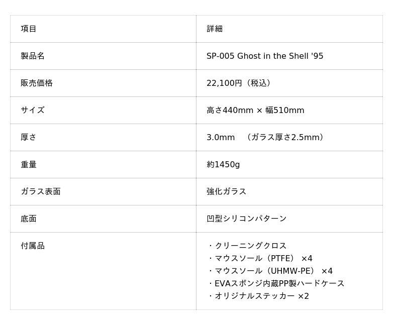 薄さ2.5mmの薄型強化ガラス表面に攻殻機動隊の代名詞とも言える草薙素子が飛び降りるシーンを大胆に配した大判ガラスマウスパッドは、プロ仕様の表面性能とアートピースとしての美しさを兼ね備えたプレミアムな製品となっています。