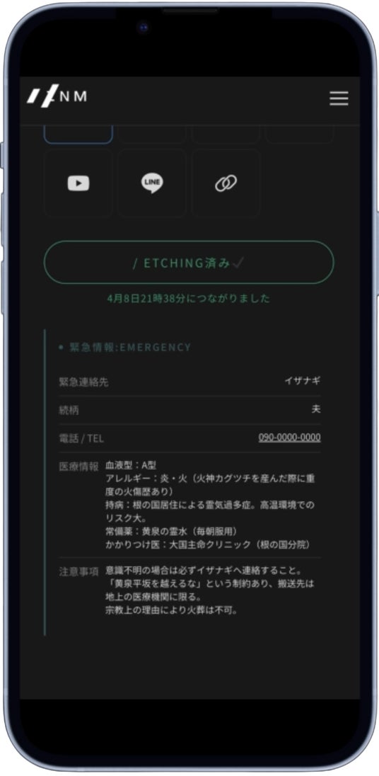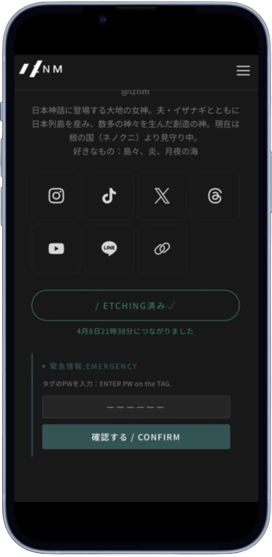 IDページの緊急情報欄で、IZNM ID TAGに刻印されたPWを入力すると、あらかじめ登録した緊急情報にアクセスできます。緊急連絡先、医療情報、注意事項など、必要な情報を日常の中に備えられます。