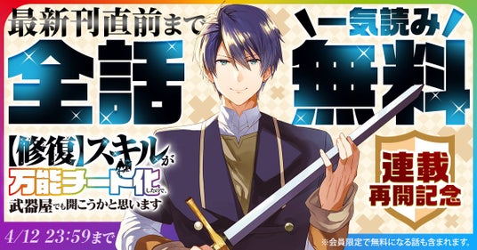 『【修復】スキルが万能チート化したので、武器屋でも開こうかと思います』(榎ゆきみ/漫画 星川銀河/原作 眠介/キャラクター原案)が48時間限定で最新刊直前まで一気読みできる全話無料キャンペーン実施!