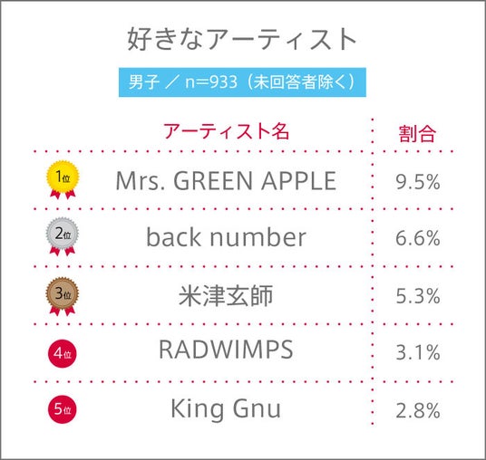 男女共通の1位は、過去の当調査でも上位常連である“Mrs. GREEN APPLE”。