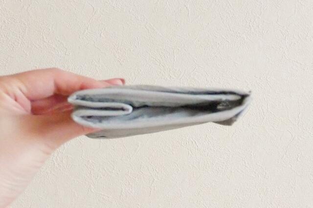 横から見ると、厚みは1〜1.5cmほど。バッグの中でもほとんど邪魔になりません。