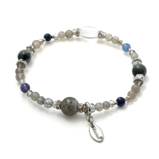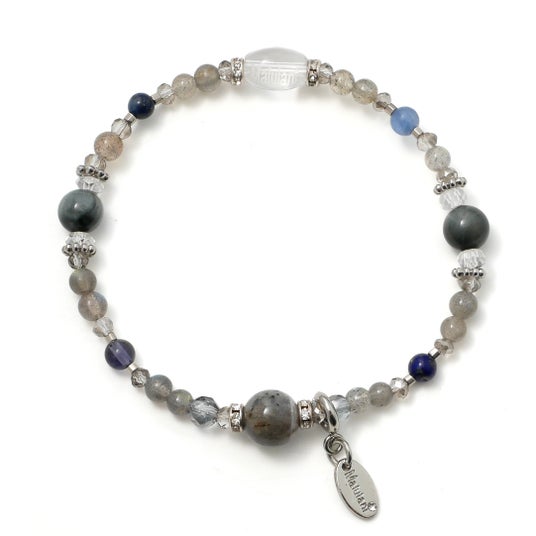 さらに、未来を見通す力の象徴とされるアイオライト、物事の本質を見抜くといわれるイーグルアイ、幻想的な光を放つシルバーオーラ、輝きを引き立てるカット水晶などを配置し、洗練された存在感のあるブレスレットに仕上げています。