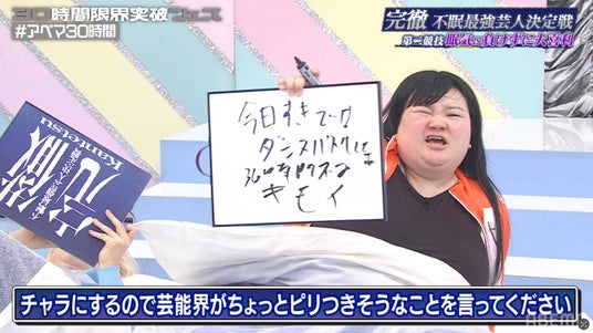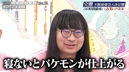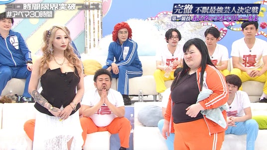 極限の睡魔と戦い、思考力や体力の限界に追い込まれていく中、本戦ではまず各チーム1名ずつ、計6名のチャレンジャーがリレー形式でお題に対する“面白いあだ名”を連続で回答する第1競技「あだ名30連発リレー」を決行。あだ名をつけられるお題の人物には、元セクシー男優・しみけんやタレント・加藤紗里も登場し、不眠状態ながらもテンポよく笑いを生み出す芸人がいる一方で、意味不明な回答や支離滅裂なワードが飛び出すなど、完徹による思考の変化が早くも表面化し、番組序盤からカオスな展開となりました。