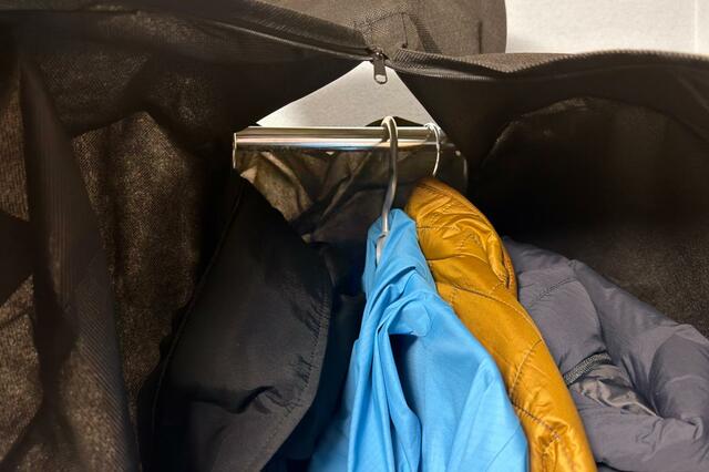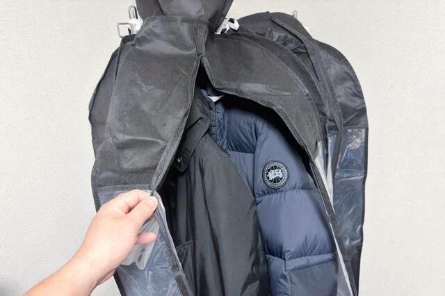 あとはファスナーを開けて、内側からハンガーに掛けた衣類をポールに通していけば完了です。
