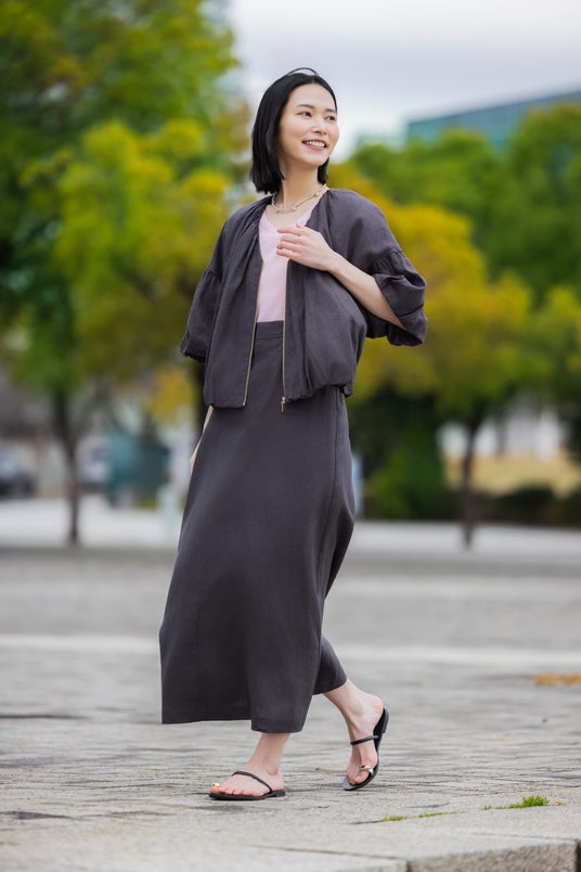 ナチュラルな素材感を都会的な印象へと引き上げてくれ、リネンならではの落ち感が、甘さをほどよく抑えてくれるのも魅力。