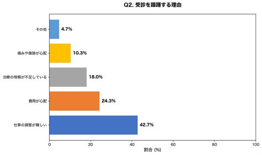 受診を妨げる「3つの障壁」として、仕事の調整(42.7%)、費用面の不安(24.3%)、情報不足(18.0%)が上位を占めた。これらの障壁を解消する適切な情報提供が、潜在的な治療ニーズの顕在化につながると考えられる。