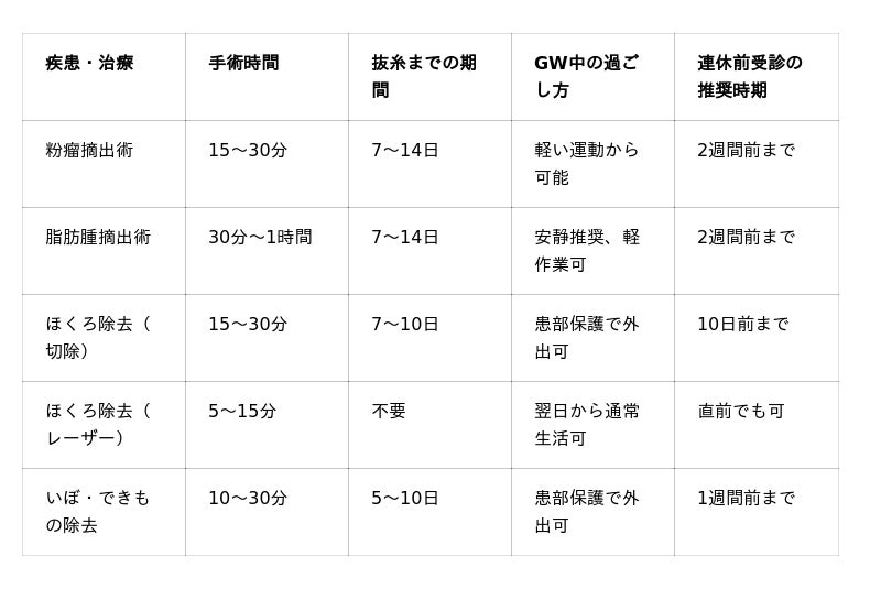 結論から言うと、GW前に粉瘤・脂肪腫・ほくろなどの皮膚腫瘍を日帰り手術で治療することは十分可能であり、連休を回復期間に充てることで仕事への影響を最小限に抑えられます。ただし、手術の種類や部位によって適切なタイミングは異なるため、遅くとも連休2週間前までの受診が推奨されます。