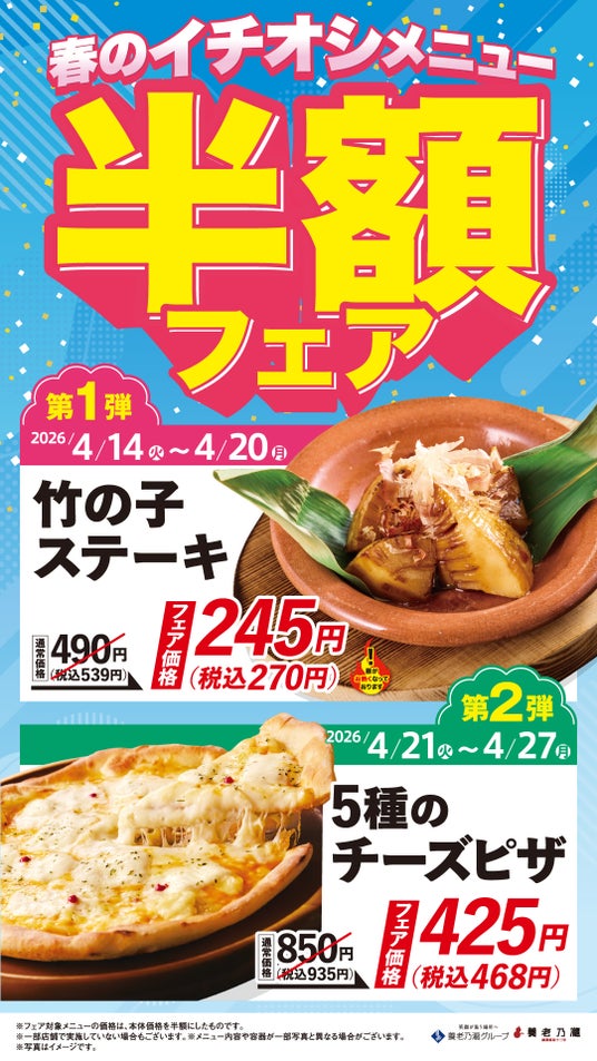 養老乃瀧株式会社(東京都豊島区、代表取締役 矢満田 敏之)は、「養老乃瀧」において行われる2026年4月14日(火)のメニュー改定に伴い、『春のイチオシメニュー半額フェア』を開催いたします。