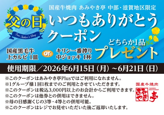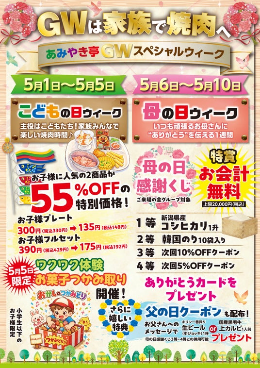 株式会社あみやき亭(本社:愛知県春日井市)は、2026年5月1日(金)から5月10日(日)までの期間、「ゴールデンウィーク企画」を開催いたします。