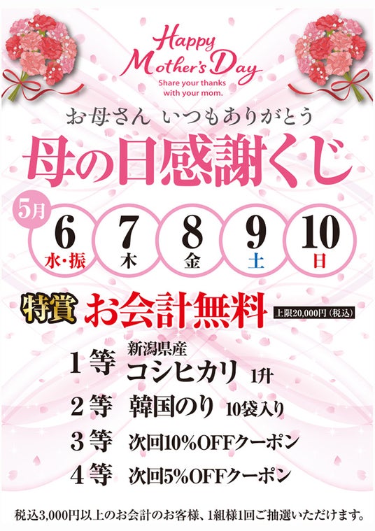 ● ハズレなし!母の日感謝くじ期間中、ご来店のお客様を対象に豪華景品が当たるくじ引きを実施。