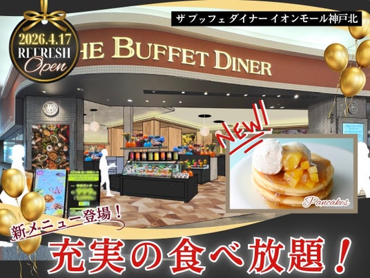 スタイリッシュな空間で、バラエティー豊かな食べ放題が楽しめる「ザ ブッフェ ダイナー イオンモール神戸北」。この度、2026年4月17日(金)より装い新たにリフレッシュOPEN!