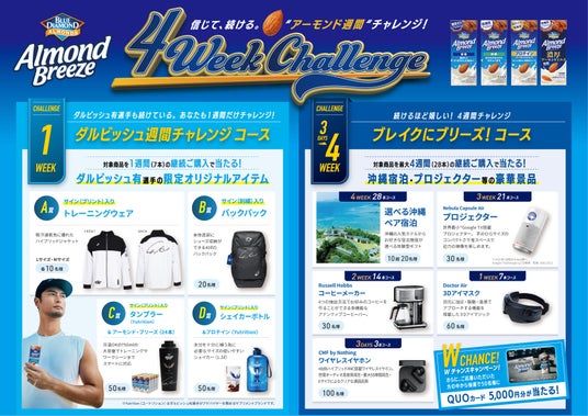 7本の購入でダルビッシュ有選手とのコラボレーションによる限定オリジナルアイテムが当たるほか、最大4週間(28本)の購入で沖縄宿泊やプロジェクターなどの豪華賞品が当たるコースにも応募いただけます。アーモンド・ブリーズを楽しみながら、ぜひキャンペーンにご応募ください。