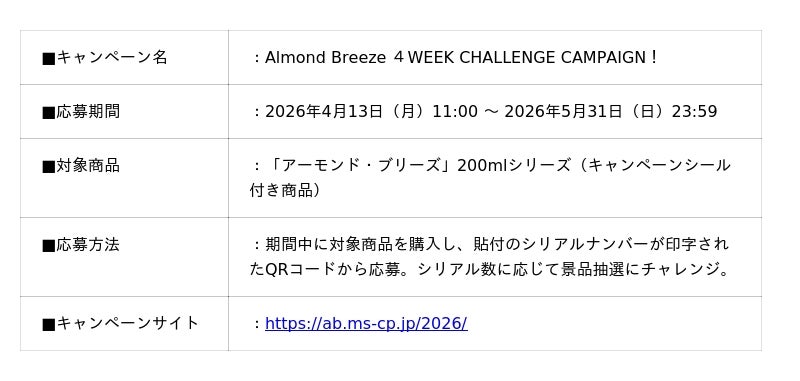 ●『Almond Breeze 4WEEK CHALLENGE CAMPAIGN!』豪華賞品が当たるキャンペーンを開催!