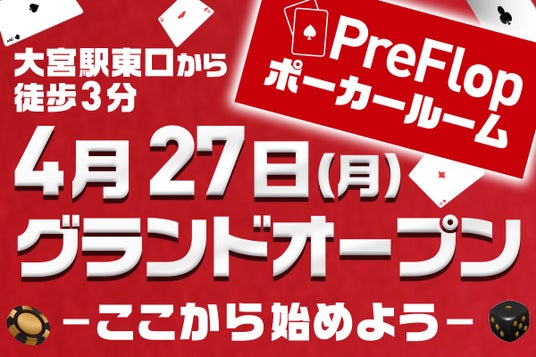 株式会社シティコミュニケーションズ(本社:神奈川県横浜市 / 代表取締役社長:三田 大明)のグループ会社、株式会社プリフロップが運営するポーカールーム「PreFlop」は、2026年4月27日(月)に3号店目となる新店舗「PreFlop 大宮」を大宮駅東口の南銀座通り沿いにオープンいたします。
