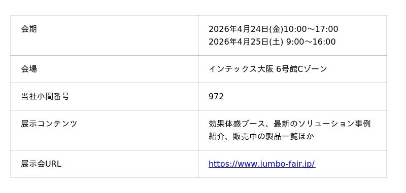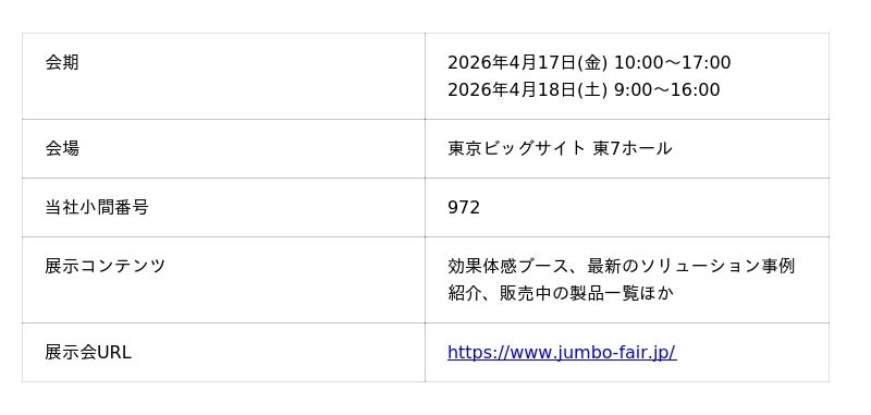 宇宙に熱を逃がしゼロエネルギーの冷却を実現する放射冷却素材「SPACECOOL(スペースクール)」を研究開発・販売するSPACECOOL株式会社(本社:東京都港区、代表取締役CEO:末光 真大以下「当社」)は、2026年4月17日(金)~18日(土)に東京ビッグサイトで、2026年4月24日(金)~25日(土)にインテックス大阪で開催される、電設資材・住宅設備の総合見本市「ジャンボびっくり見本市」に出展いたします。