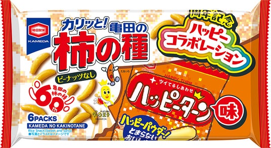 『ハッピーターン 亀田の柿の種味』は、ハッピーパウダーの“あまじょっぱさ”を残しながら、亀田の柿の種のピリ辛な醤油の香ばしさと、ピーナッツの香りを掛け合わせた「亀田の柿の種」の味わいを加え、コラボレーションならではの食べ進めるほどクセになる味わいに仕上げています。