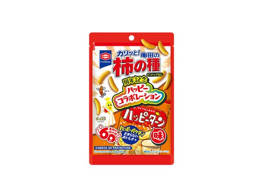 『亀田の柿の種 ハッピーターン味』は、ハッピーターンの唯一無二である、あの“あまじょっぱい”おいしさを、亀田の柿の種ならではの独自の味付け製法で再現しました。さらに、その独自製法の一つである、油をかけて仕上げる「カリッとスナック製法」により、よりクリスピーで軽快な食感をお楽しみいただけます。亀田の柿の種らしい“カリッと”食感をそのままに仕上げました。