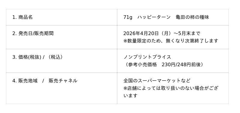 柿の種のカリッと軽快な食感が生み出す、リズミカルで止まらないおいしさと、“お客様に幸せが戻って来るように”という想いから生まれたハッピーターンの唯一無二のあまじょっぱさ。両ブランドの個性を生かしながら、今だけの特別なコラボレーションで、新しいおいしさを提案します。いつものおやつ時間はもちろん、仕事の合間や家飲みなど、これまでとは少し違う食シーンにも広がる“限定コラボ体験”で、毎日に寄り添うワクワクを生み出し続けていきます。W周年の節目を彩る今だけの特別企画として、これからの「亀田の柿の種」と「ハッピーターン」にぜひご期待ください。