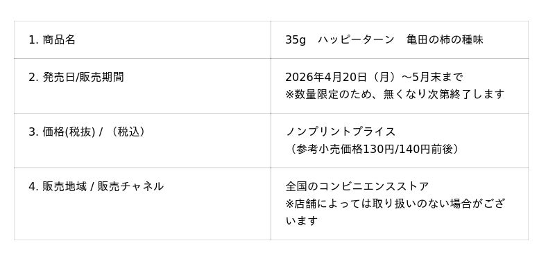 それぞれの“らしさ”を崩さずに味を追求したことで、ひと口目から“いつものおいしさ”を感じつつ、食べ進めるほど新しさが広がる味わいに仕上げました。亀田の柿の種とハッピーターン、それぞれの個性を生かしながら、周年だからこそ実現できたコラボレーション商品です。思わず「どんな味?」と確かめたくなるロングセラー同士ならではの新しい楽しみ方をお届けします。